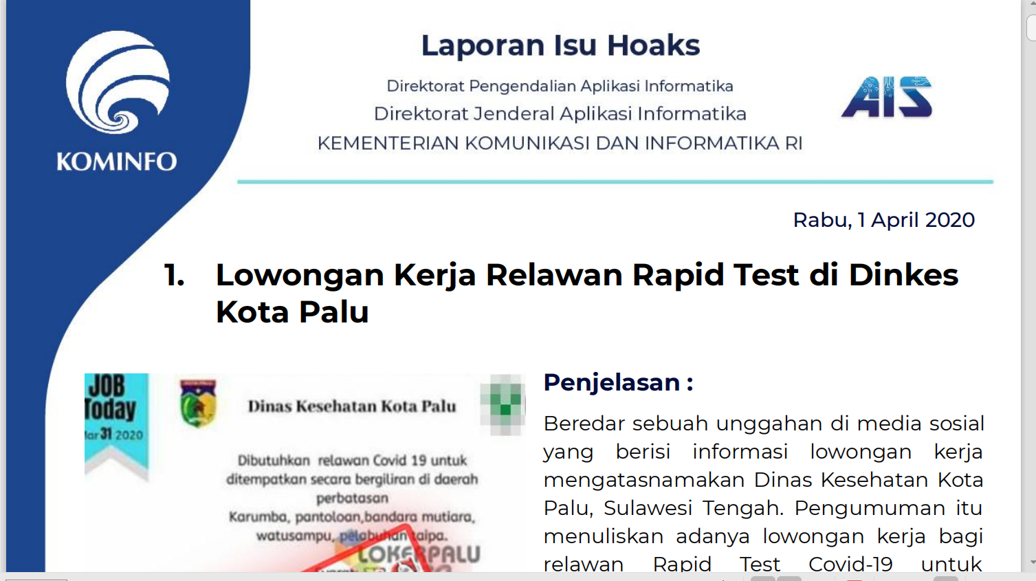 Informatika RI kembali menginformasikan bahwa isu hoaks dalam satu hari saja